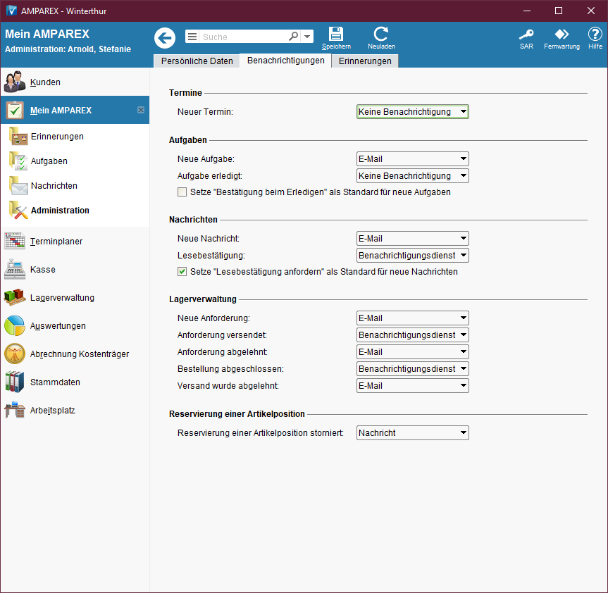 Hier gilt, dass alle aktuellen Aufträge ordentlich gepflegt werden. Nach Abschluss und Abbruch ist ein Vorgang passend zu dokumentieren und zu schliessen. Die Grundlegende Einstellung von „Mein Amparex“ ist wie rechts dargestellt.