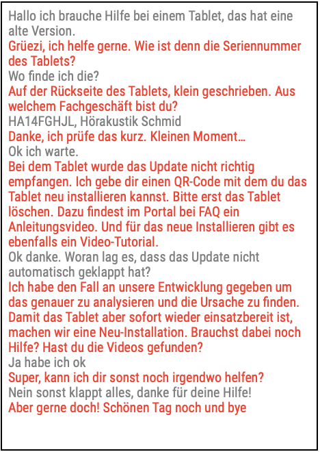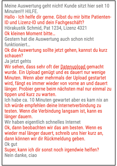 - Keine Auskünfte über: Preise, andere Kunden/Supportfälle, Häufigkeit von Problemen, interne Informationen