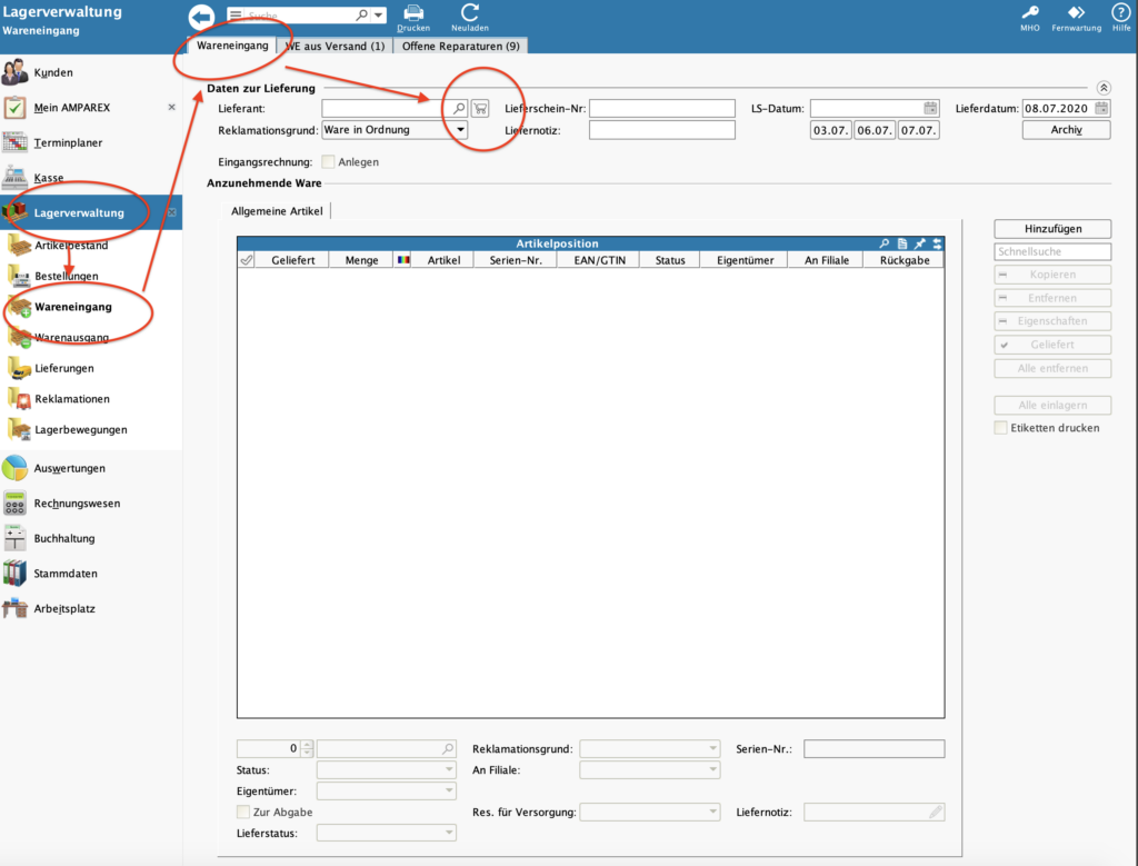 Sobald Ihr die Bestellung erhalten habt, geht Ihr wie gewohnt unter „Lagerverwaltung“ in den „Wareneingang“. Neben dem Slot „Lieferant“ findet Ihr ein „Einkaufswagen-Symbol“. Klickt dort drauf und wählt die Bestellung aus, welche eingetroffen ist. Nun müsst Ihr nur noch die Lieferscheinnummer, das Datum und ggf. eine Notiz eingeben. Die Produkte sind automatisch aufgeführt und Ihr könnt die Ware einlagern.